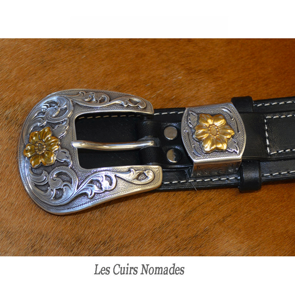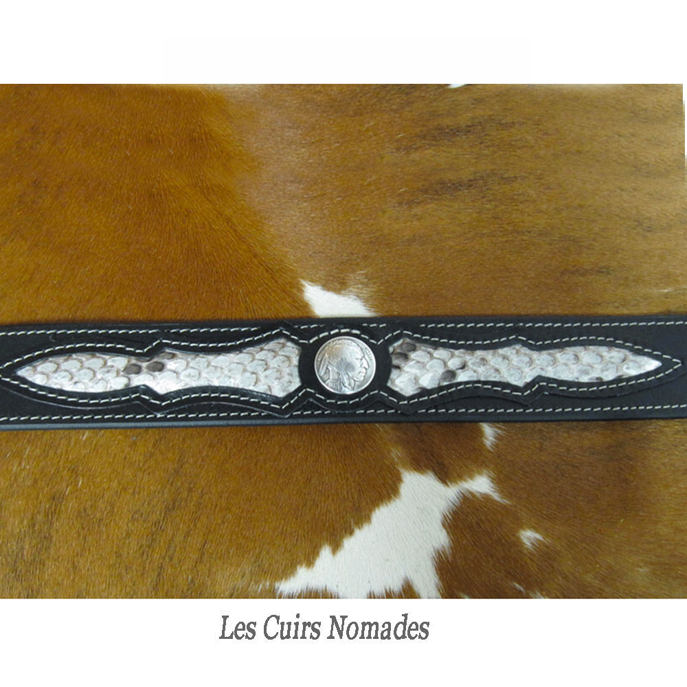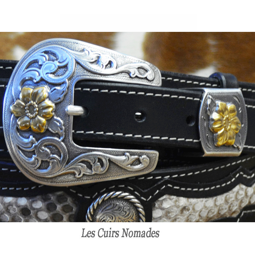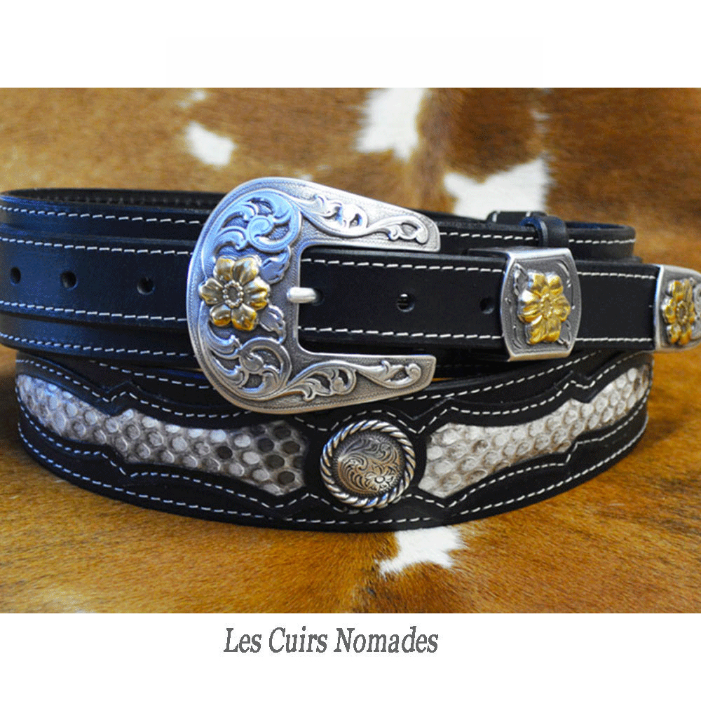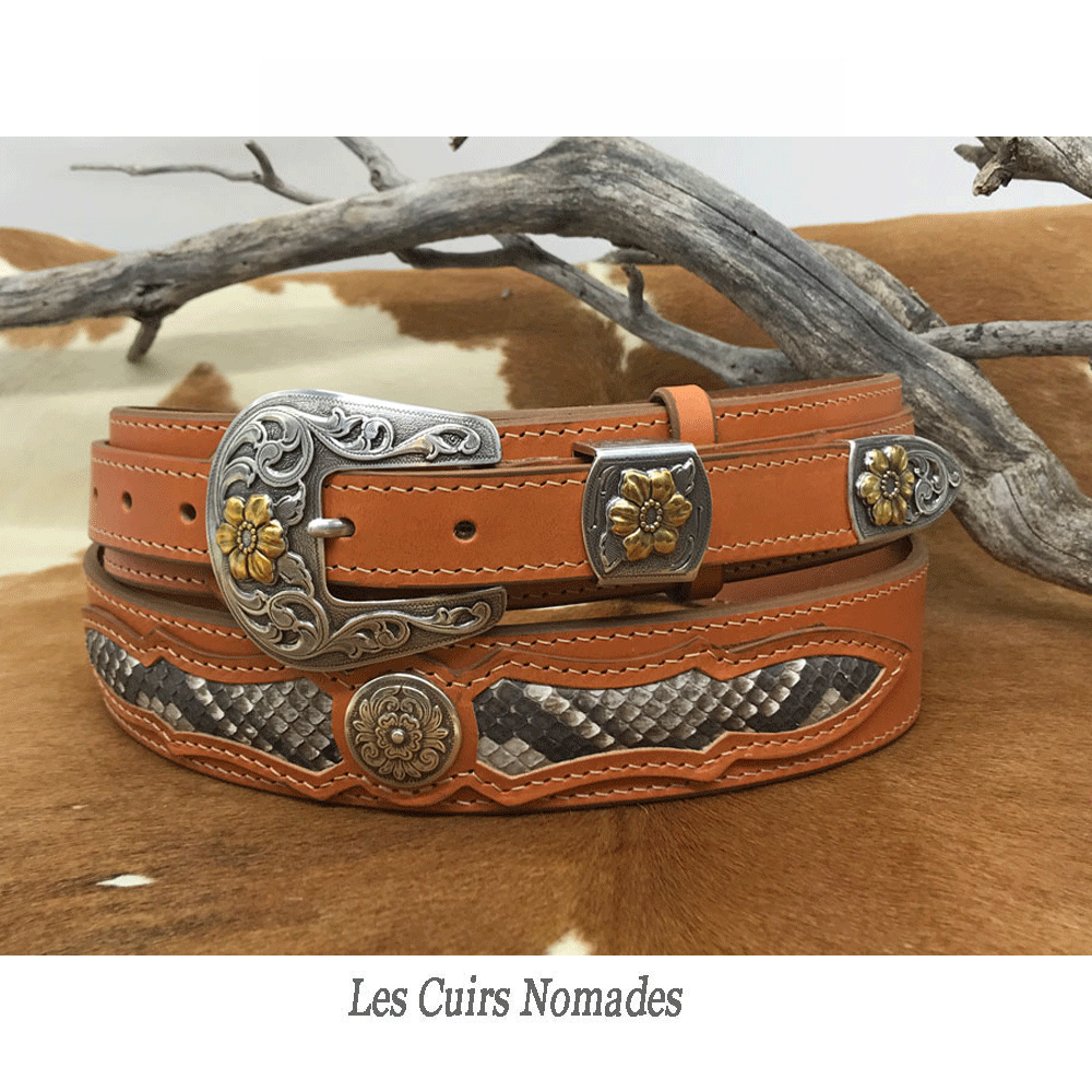 Ceinture en cuir 4cm de largeur, en vachette pleine fleur coupée dans des collets de premier choix. Boucle modèle « CALIFORNIA » en trois parties, la boucle, le passant et le bout de ceinture sont en Plaqués Argent gravés et polis à la main. Au centre de la ceinture une décoration en peau de Python Véritable et un conchas Tête d’Indien en Plaqué Argent. Cette ceinture vous accompagnera des années.